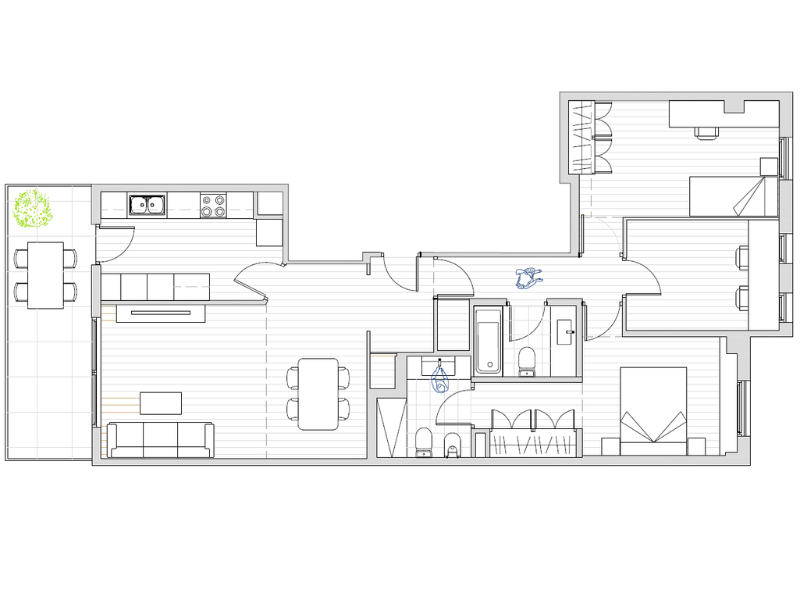 La pareja adquirió un piso de tres habitaciones, una de ellas en suite, y buscaba renovar el espacio sin modificar la distribución original. El objetivo era actualizar la vivienda y ganar capacidad de almacenamiento en baños y cocina.